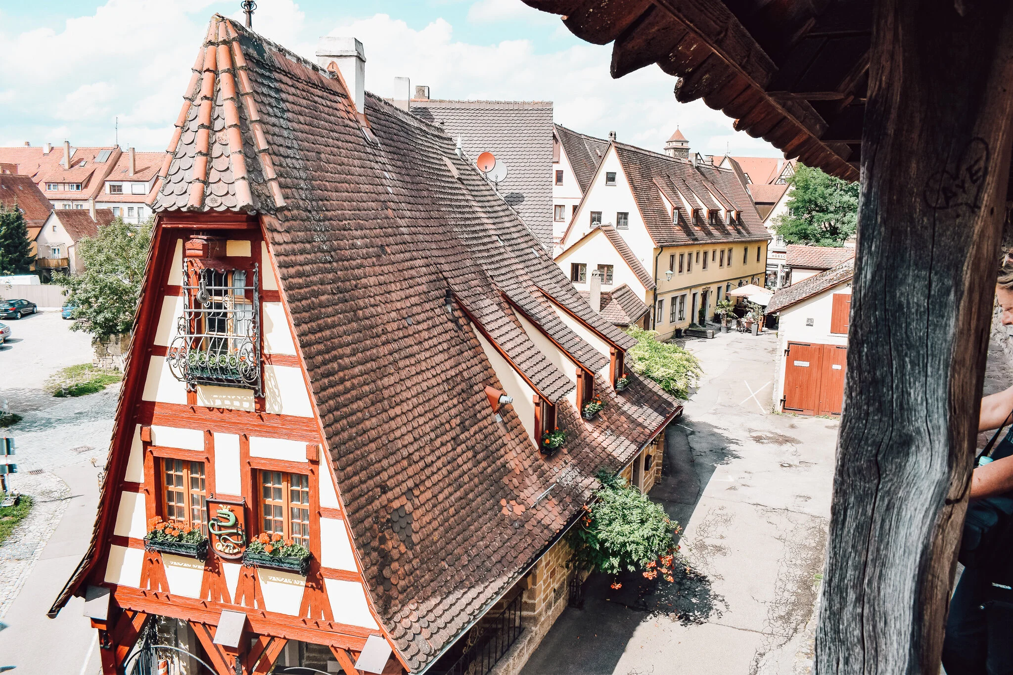 We had to drive through the castle gates to enter the city. Stone walls encase the whole thing. I almost hit every single stone upon entering. Then, I actively avoided pedestrians. Rothenburg is the only city in Germany with its original, medieval fortifications still standing. The street widths aren’t regulated.